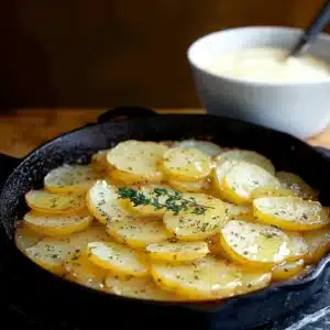 - Layer the Potatoes: Arrange a layer of potato slices in a cast-iron skillet, slightly overlapping each piece. Brush with brown butter and sprinkle with salt and pepper.