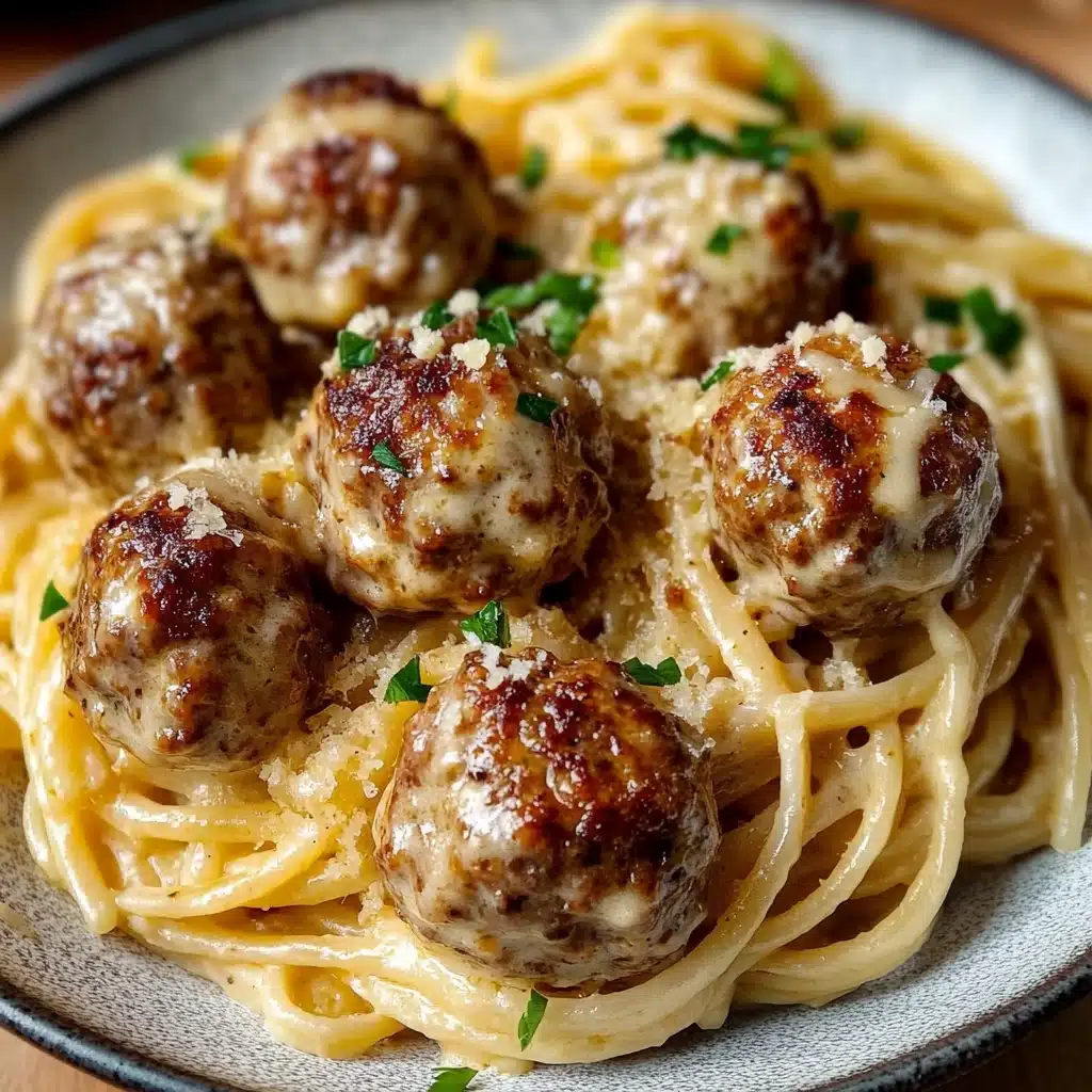 Serve meatballs over a bed of creamy linguine. Drizzle with extra garlic butter from the pan. Garnish with more parsley and Parmesan.