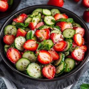 - Combine Everything: In a large bowl, add cucumber, strawberries, red onion, and mint. Drizzle the dressing over the top.